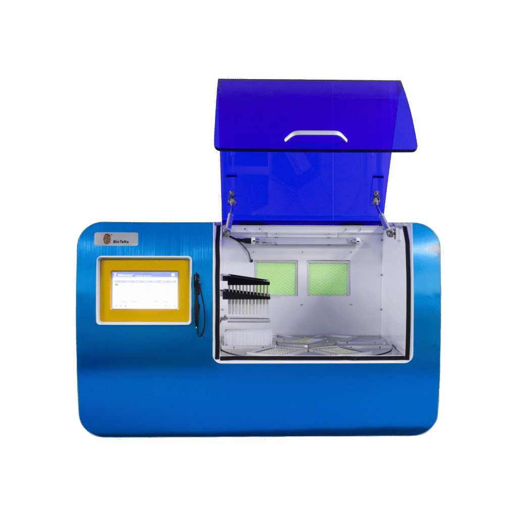 5β10 mL and multiple specimen types including plasma, swab eluates, and whole blood. Equipped with barcode scanning, HEPA filtration, and UV